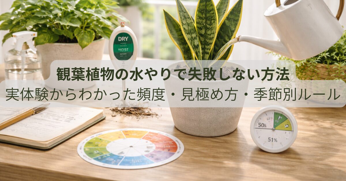 観葉植物を育てるうえで、最も失敗が多いのが水やりです。僕自身も最初は「水は多い方がいい」と思い込み、結果として植物を弱らせてしまいました。見た目は元気そうでも、土の中では根がダメージを受けていることもあります。この記事では、パキラとサンスベリアで実際に経験した失敗をもとに、水やりの正しい頻度や見極め方、季節ごとのルールまで具体的にまとめました。初心者の方が同じ失敗をしないための実践的な内容です。